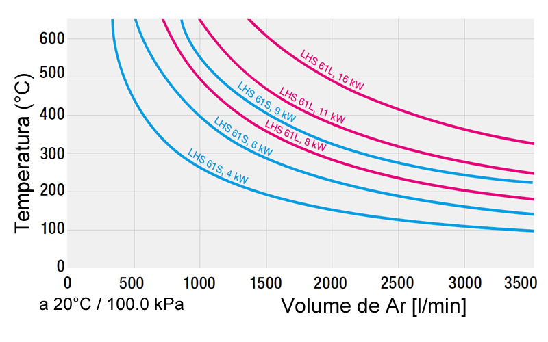 | Tipo do Soprador | Quantidade de LHS 61S x Potência em Kw | LHS 61S x Fluxo de Ar (l/min) | Temperatura °C |